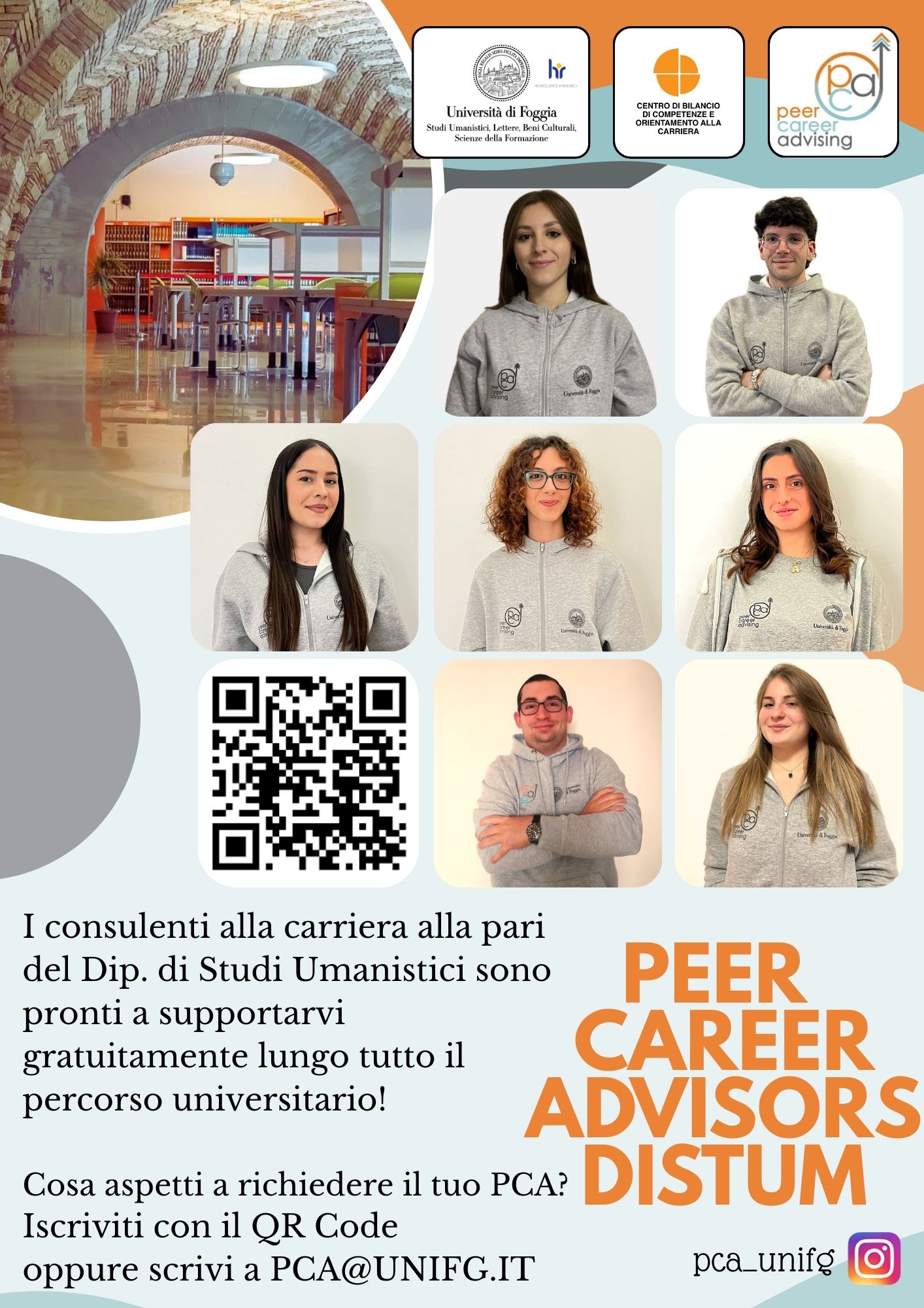 Il servizio, attivo in tutti i Dipartimenti, è totalmente gratuito, aderendo al servizio si ha a disposizione un Peer Career Advisor (PCA), un personale consulente di carriera alla pari. Peer Career Advising è infatti un innovativo servizio di consulenza orientativa personalizzata, condotto da studenti "senior", che accompagnano e sostengono gli studenti iscritti a tutti i corsi di laurea Unifg (triennali e magistrali) durante l'intero corso di studi, e fino a 6 mesi dal conseguimento del titolo di laurea, nelle decisioni formative e professionali offrendo loro consulenze di orientamento individuali o in piccoli gruppi su specifiche tematiche, come ad esempio: pianificazione esami, acquisizione metodi e tecniche di studio, fronteggiamento preoccupazioni e paure legate allo studio e al futuro, migliore conoscenza del Sé e sviluppo personale, realizzazione strumenti di self marketing (come ad esempio il CV o video CV), progettazione tesi di laurea, costruzione progetto di sviluppo formativo-professionale, gestione efficace del processo di selezione, supporto creazione profilo su piattaforma UniPlacement, ecc.