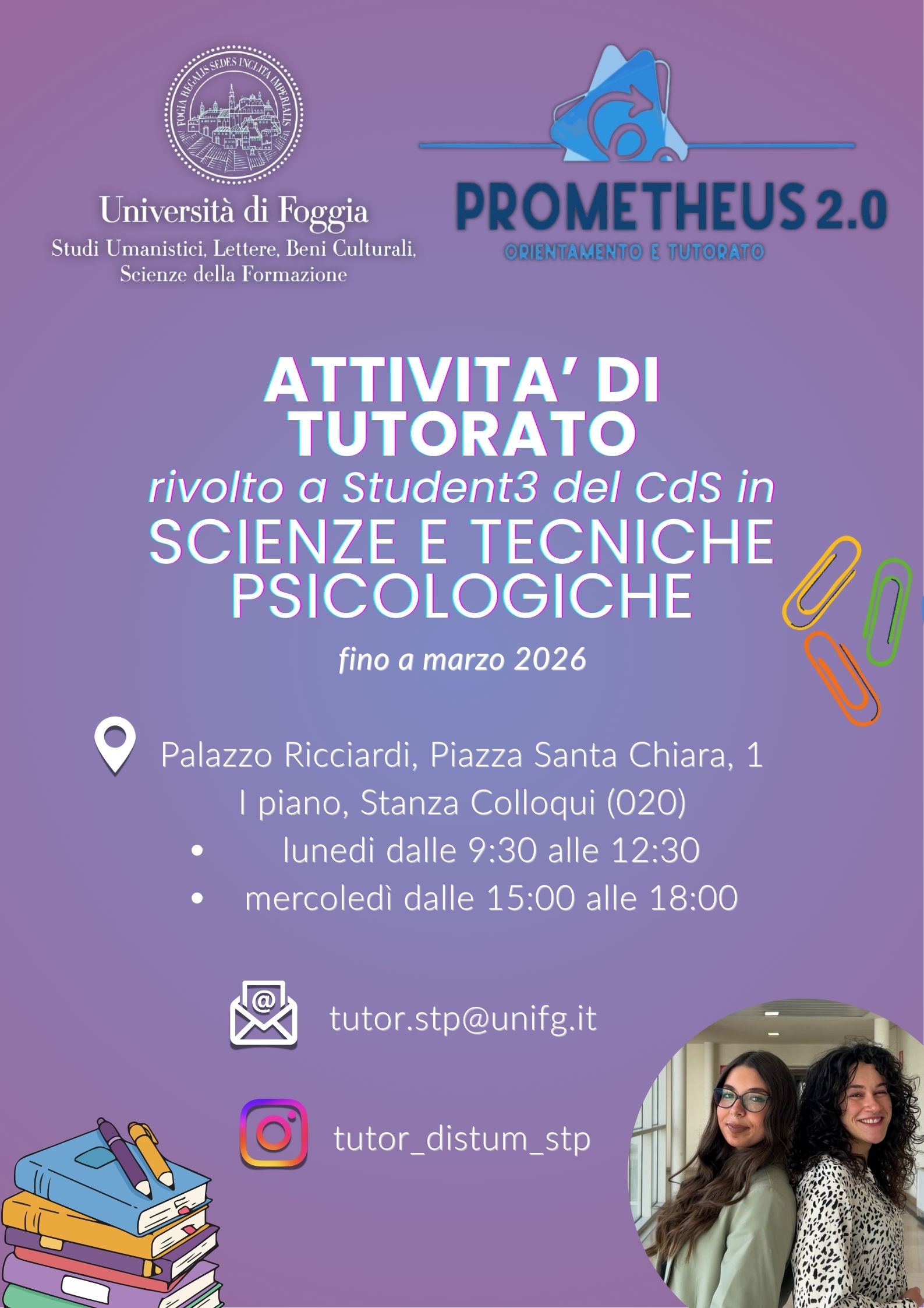 È attivo il servizio di tutorato per le persone iscritte al Corso di Laurea in Scienze e Tecniche Psicologiche, nell’ambito del progetto PROMETHEUS 2.0 – Orientamento e Tutorato. Il servizio sarà attivo fino a marzo 2026 e offre supporto su piani di studio, esami, servizi di Ateneo e opportunità formative. Le tutor, Maria e Marika, sono a disposizione in presenza negli orari di sportello, oppure via email/DM di Instagram tutti i giorni da lunedì e venerdì dalle 9.00 alle 18.00.