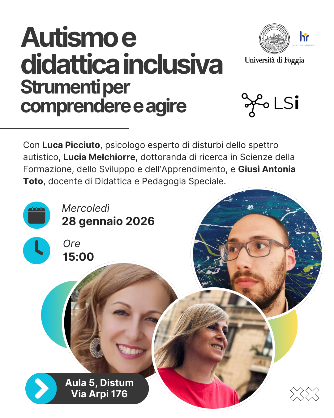 La scuola del futuro non può prescindere da una competenza specifica sulla neurodivergenza. È con questa consapevolezza che la prof.ssa Giusi Antonia Toto, docente ordinaria di didattica e pedagogia speciale e coordinatrice del Learning Sciences Institute (LSi), dell’Università di Foggia ha organizzato un nuovo un appuntamento per la formazione dei docenti di domani. Mercoledì 28 gennaio 2026, alle ore 15.00, l’Aula 5 del Dipartimento di Studi Umanistici (DISTUM) ospiterà il seminario “Autismo e didattica inclusiva: strumenti per comprendere e agire."