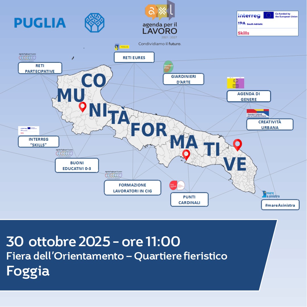 Il 30 ottobre 2025 la Fiera di Foggia (corso del Mezzogiorno, 1) ospiterà la seconda tappa dell’iniziativa regionale “Comunità Formative”, promossa dall’Assessorato alle Politiche del Lavoro, dell’Istruzione e della Formazione della Regione Puglia.
