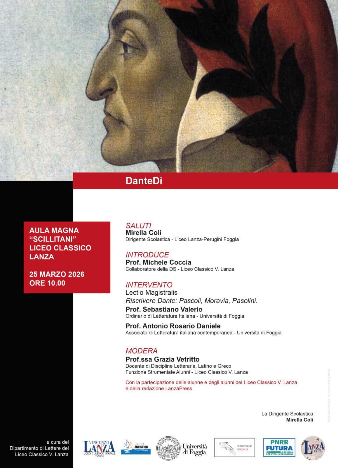 In occasione del Dantedì (25.03.2026, ore 10), i proff. Sebastiano Valerio e Antonio R. Daniele terranno una lezione presso il Liceo Lanza di Foggia su "Riscrivere Dante: Pascoli, Moravia, Pasolini". Modera la prof.ssa Grazia Vetritto.
