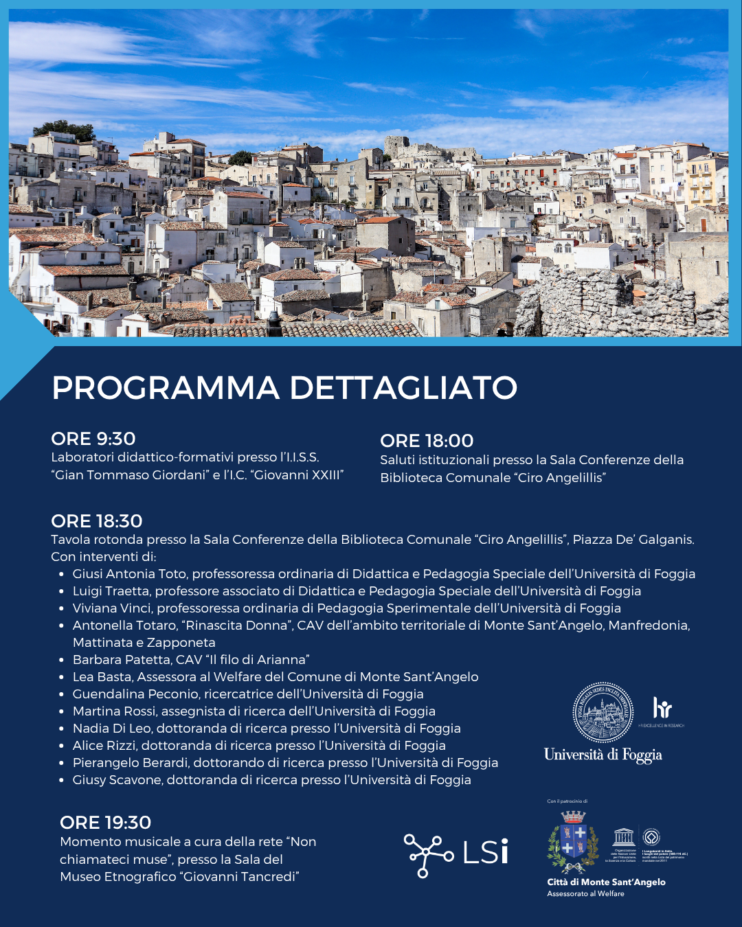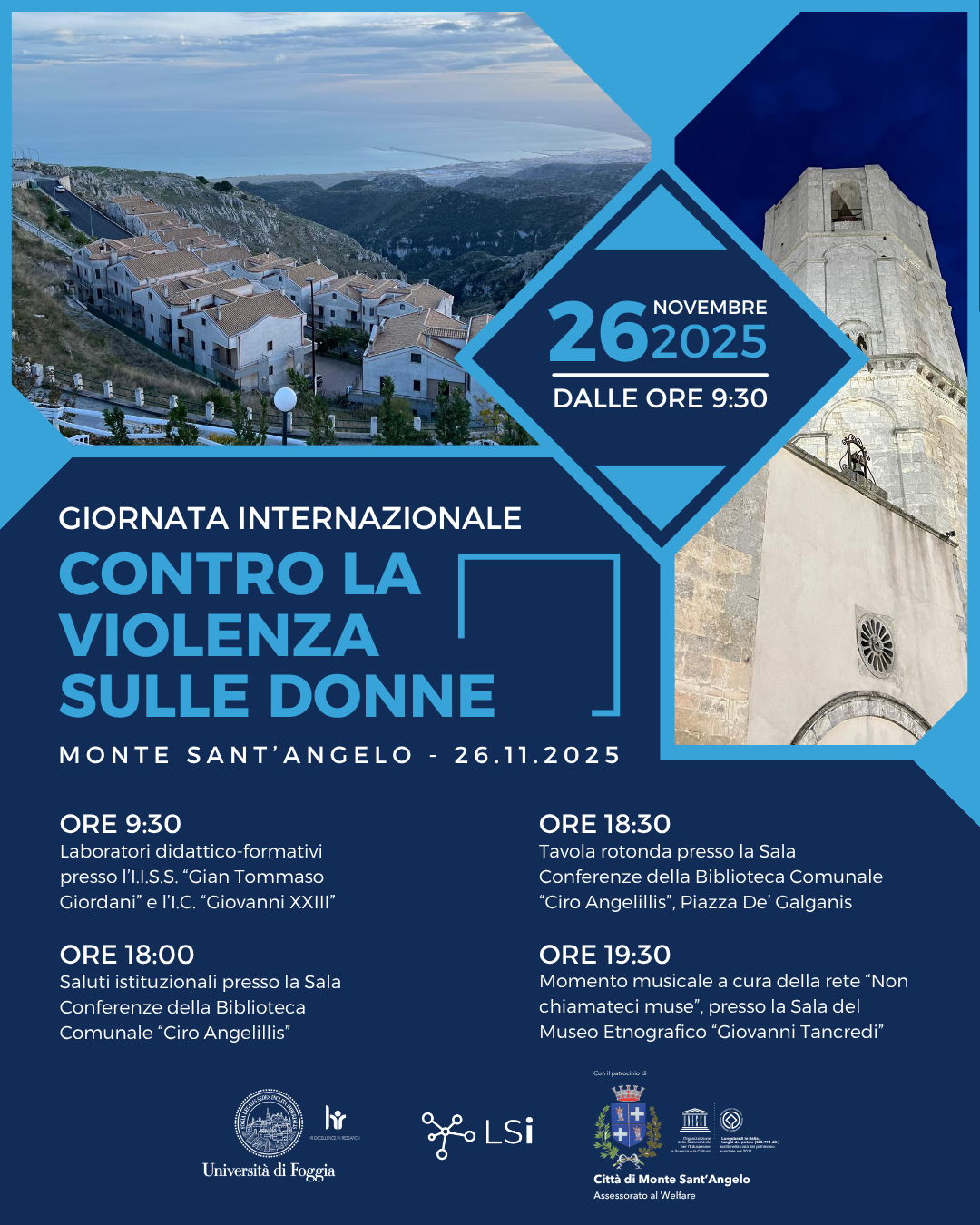 L’Università di Foggia partecipa alla Giornata Internazionale contro la Violenza sulle Donne, in programma il 26 novembre a Monte Sant’Angelo, con la presenza della prof.ssa Giusi Antonia Toto, del prof. Luigi Traetta e di ricercatrici e dottorande del Learning Sciences institute