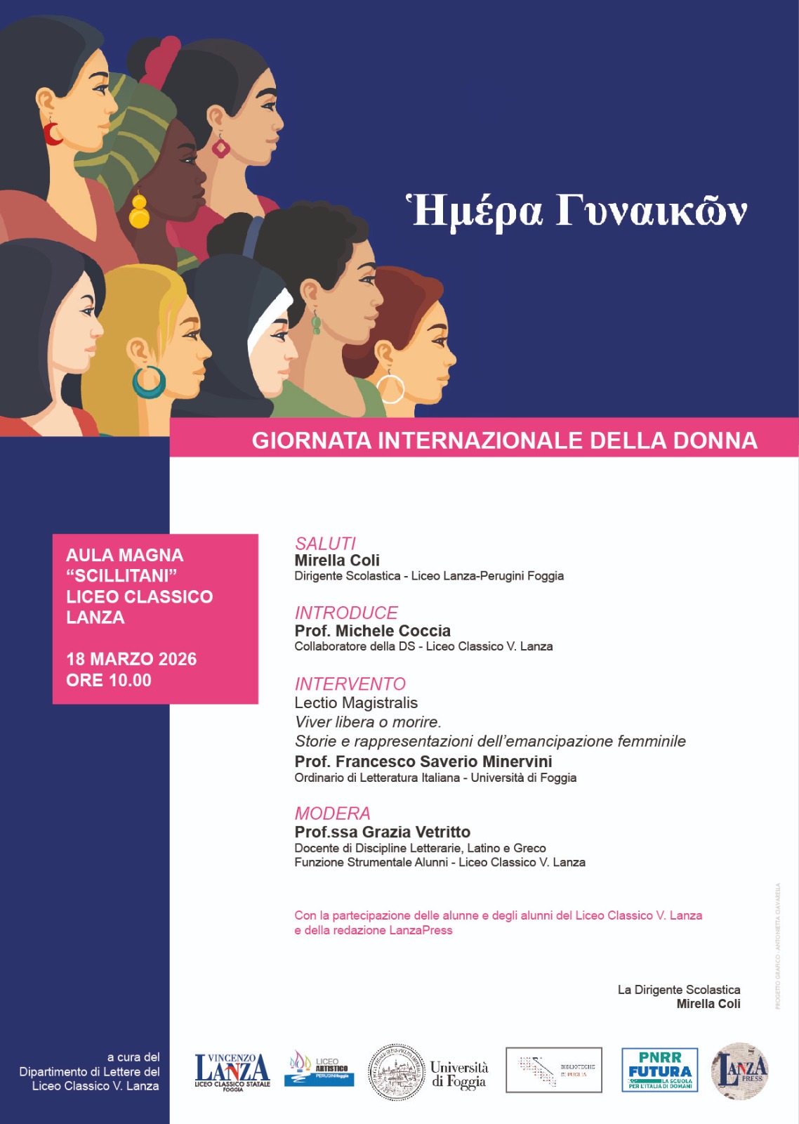Mercoledì 18 marzo 2026 presso il Liceo Classico Lanza di Foggia, nell' ambito delle celebrazioni della Giornata Mondiale della Donna, il prof. Francesco Saverio Minervini terrà una conferenza dal titolo "Viver libera. Storie e rappresentazioni dell'emancipazione femminile".