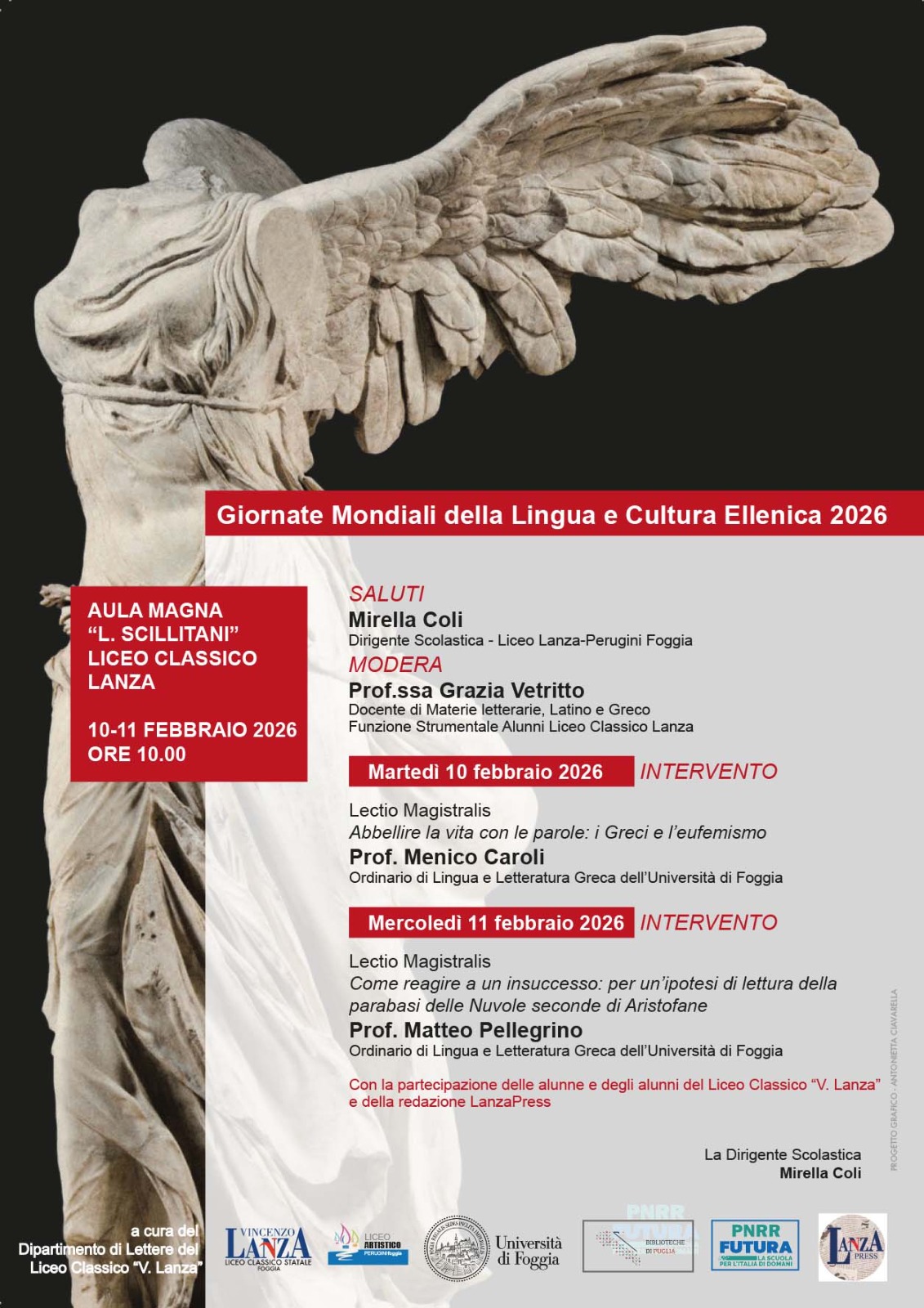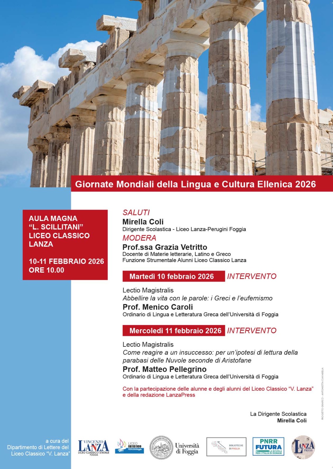 Nei giorni martedì 10 e mercoledì 11 febbraio 2026 il prof. Menico Caroli e il prof. Matteo Pellegrino terranno due lezioni nel corso delle attività promosse dal Liceo Classico “V. Lanza” di Foggia nell’ambito della celebrazione delle Giornate Mondiali della Lingua e Cultura Ellenica.