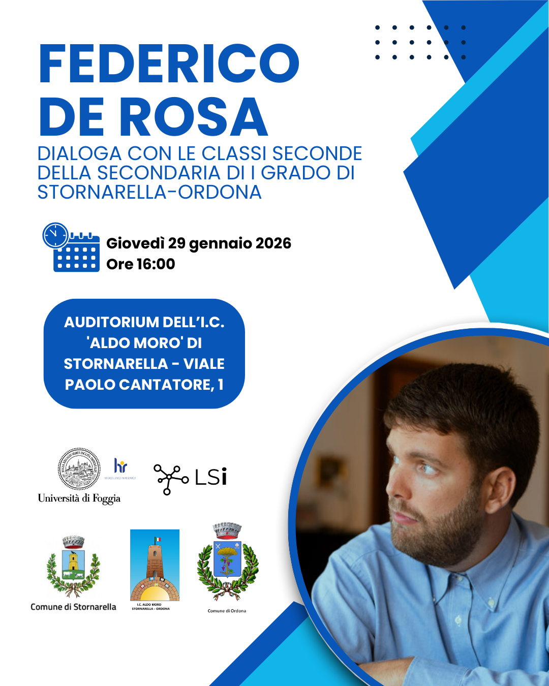 Giovedì 29 gennaio 2026, alle ore 16:00, presso l'Auditorium dell'I.C. 'Aldo Moro' di Stornarella, si terrà un incontro con lo scrittore Federico De Rosa, che dialogherà con le classi seconde della scuola secondaria di I grado di Stornarella-Ordona.