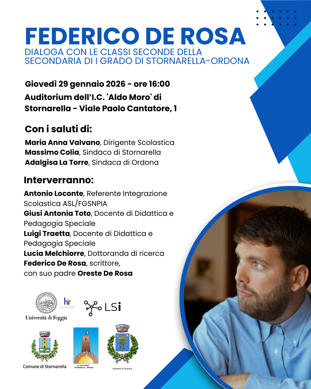 L'evento sarà introdotto dai saluti della Dirigente Scolastica, Maria Anna Valvano, del Sindaco di Stornarella, Massimo Colia, e della Sindaca di Ordona, Adalgisa La Torre. Seguiranno gli interventi di Antonio Loconte, Referente Integrazione Scolastica ASL/FGSNPIA, Giusi Antonia Toto e Luigi Traetta, entrambi Docenti di Didattica e Pedagogia Speciale, e Lucia Melchiorre, Dottoranda di ricerca. L'incontro vedrà anche la partecipazione di Oreste De Rosa, padre dello scrittore.