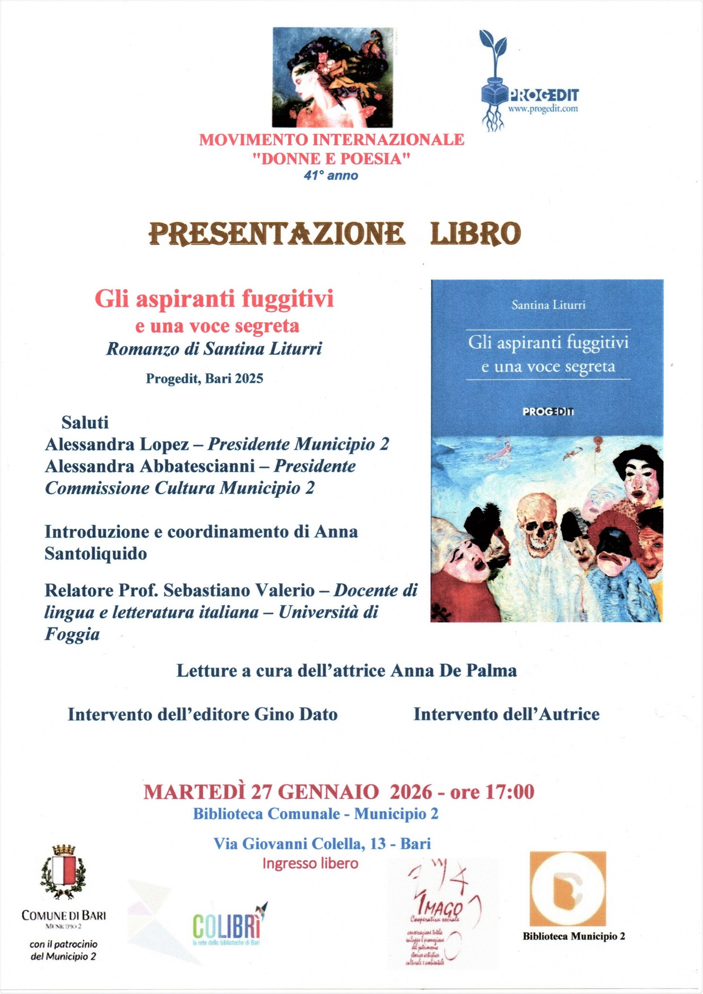 Il prof. Sebastiano Valerio presenterà il giorno 27/01/2026 alle ore 17.00 il romanzo "Gli aspiranti fuggitivi e una voce segreta" (Progedit, 2026) a Bari, presso la Biblioteca del Municipio 2 (via Colella, 13).