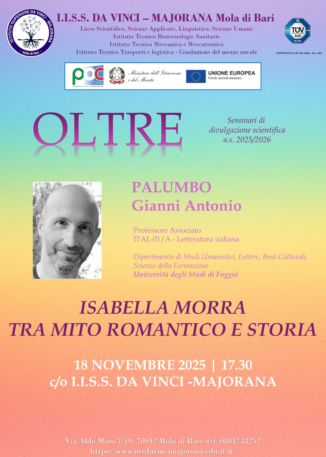 Nell'ambito delle iniziative di "Oltre", Seminari di divulgazione scientifica a.s. 2025-2026, l'I.I.S.S. Da Vinci-Majorana di Mola di Bari ospiterà la conferenza di Gianni Antonio Palumbo, professore associato di Letteratura italiana (ITAL-01/A) presso il Dipartimento di Studi Umanistici dell'Università degli Studi di Foggia, dal titolo "Isabella Morra tra mito romantico e storia".