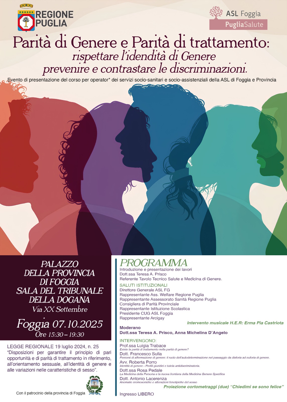 L’iniziativa, patrocinata dalla Provincia di Foggia, vedrà la partecipazione di rappresentanti della Regione Puglia, della ASL Foggia, di enti locali e di associazioni impegnate nella promozione del welfare, della salute e delle pari opportunità.