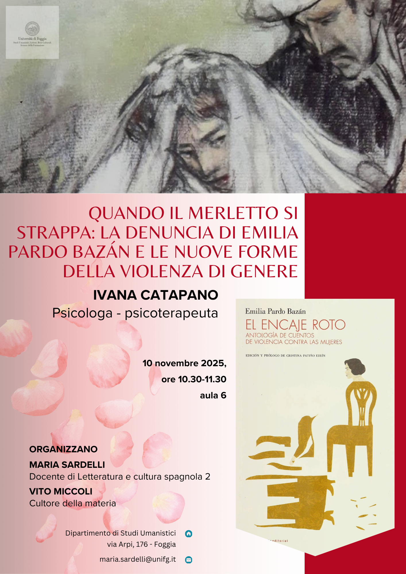 Il 10 novembre 2025, dalle ore 10.30 alle 11.30, presso l’Aula 6 del Dipartimento di Studi Umanistici dell’Università di Foggia (Via Arpi, 176), si terrà l’incontro dal titolo “Quando il merletto si strappa: la denuncia di Emilia Pardo Bazán e le nuove forme della violenza di genere”.