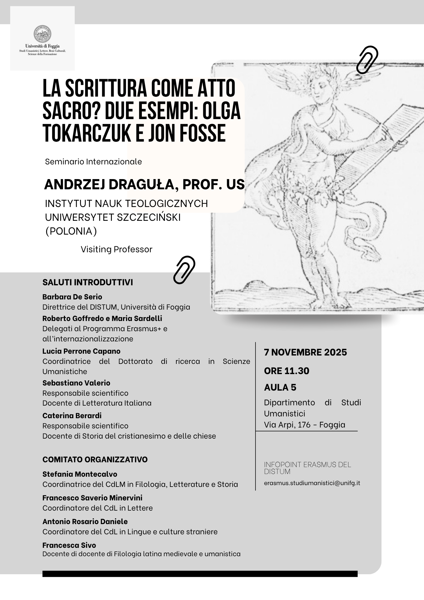 IIl 7 novembre 2025, alle ore 11.30 presso l’Aula 5 del Dipartimento di Studi Umanistici dell’Università di Foggia (Via Arpi, 176), si terrà il seminario internazionale dal titolo “La scrittura come atto sacro? Due esempi: Olga Tokarczuk e Jon Fosse”.